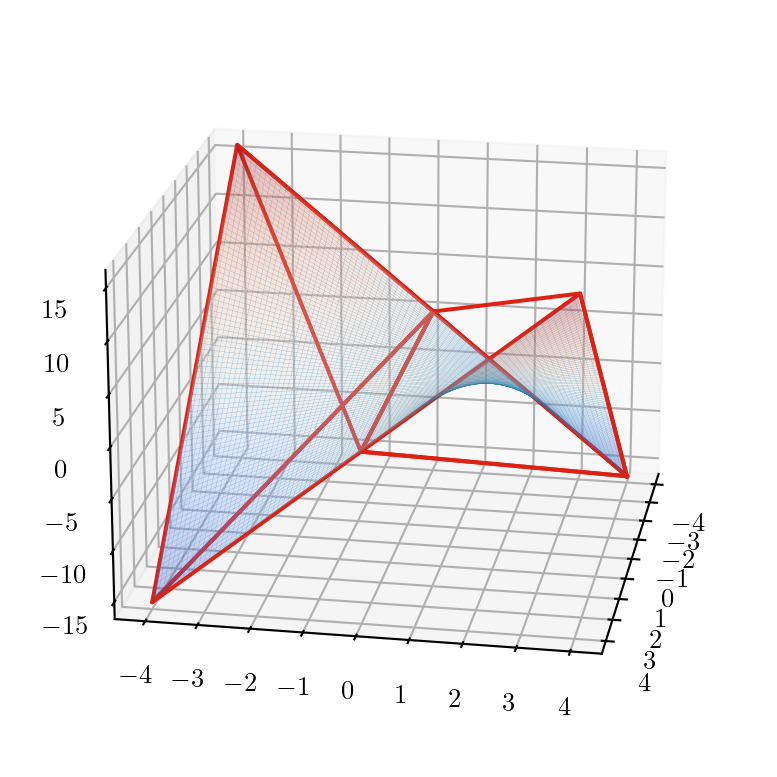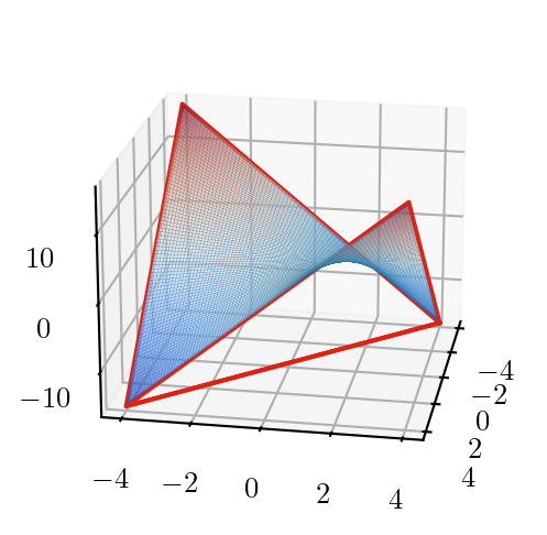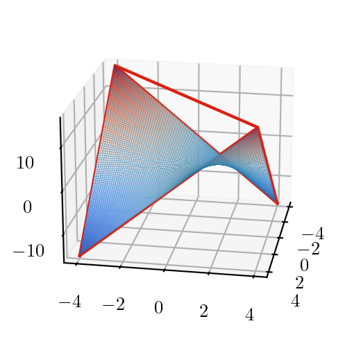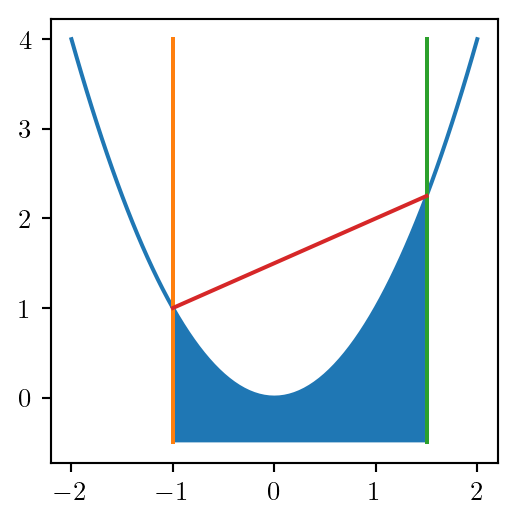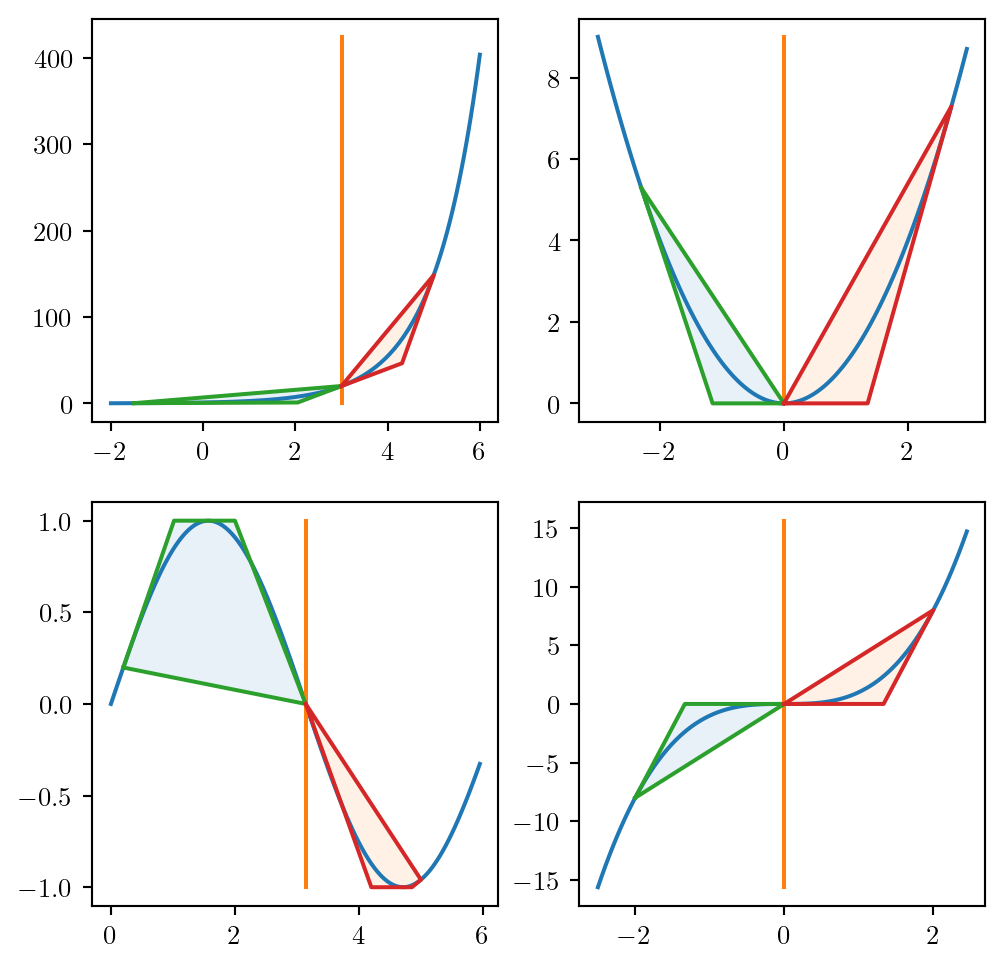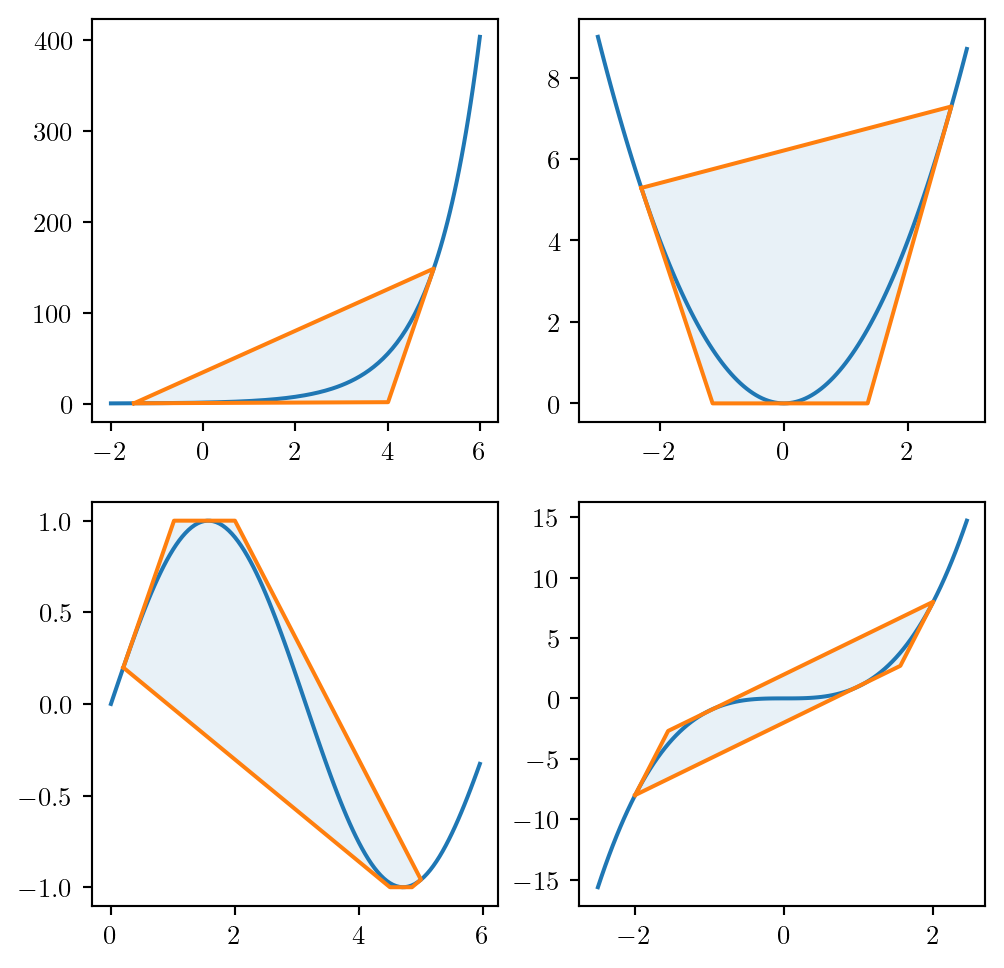 \(z^+(x_i, x_i)\) is given by the secant: \[ z^+_{ii} = (u + l) x_i - l \cdot u \]